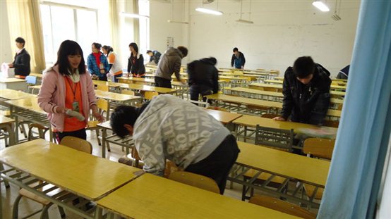 在大家的共同忙碌下,一间间干净整齐课室呈现在大家的眼前。参与活动的同学们用他们的辛劳与汗水能换来全院师生整洁的校园环境,但是如果每一个人在平时都能持有爱护校园环境卫生的意识,纸屑不到处乱扔,不在课桌上乱写乱画,我们就能时刻拥有一个温馨美丽的校园。
