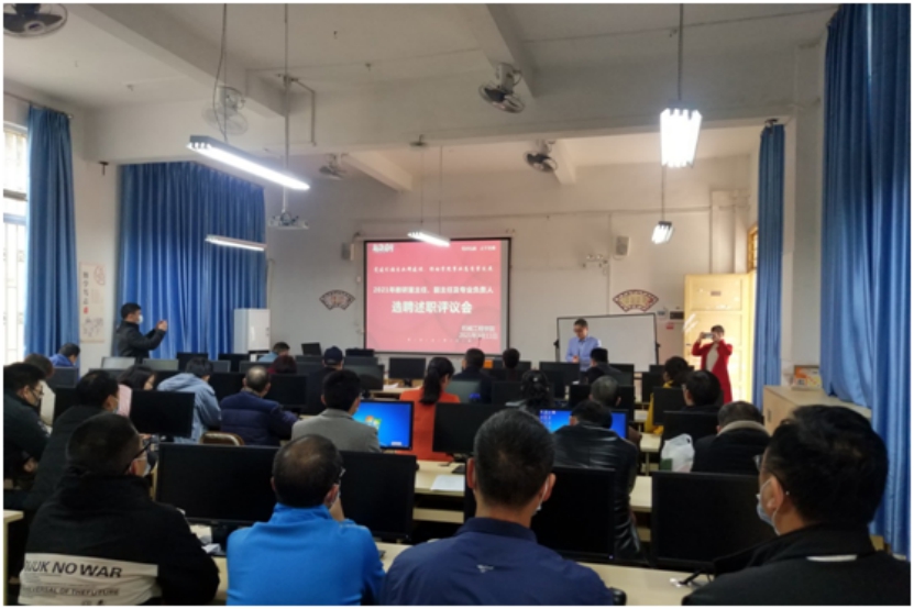 2021年3月11日下午,机械工程学院在宽B105召开了教研室主任、副主任及专业负责人选聘述职评议会。机械工程学院党总支副书记赵保宁、教学质量监测中心主任赵华、信息管理科科长姜博,教务部综合科科长詹玉芬以及机械工程学院全体教职工参会。会议由机械工程学院副院长刘松主持,11名骨干教师参加了选聘述职,并就应聘岗位的优势与不足、工作思路规划等方面进行演讲陈述。
