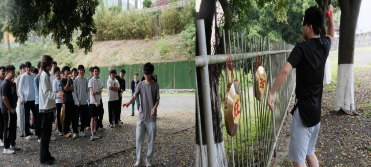 紧接着进行的蒙眼寻锣游戏将活动氛围推向高潮。蒙眼同学在队友的口令指引下,小心翼翼地摸索方向,最终敲响铜锣。这一过程不仅考验了参与者的平衡感与方向感,更让大家深刻体会到信任与沟通在团队协作中的重要性,有效增强了集体凝聚力。