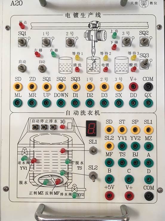 可编程控制器20台、计算机15台、天塔之光、水塔水位、装配流水线、十字路口交通灯、电镀生产线、全自动洗衣机、机械手控制、自动售货机、四层电梯、模拟量输入输出模块、变频器、触摸屏等各13套。